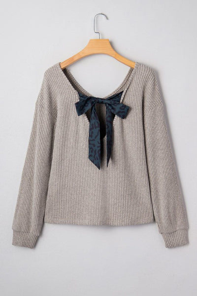 Bow Tie Back Leopard Long Sleeve V-Neck Top