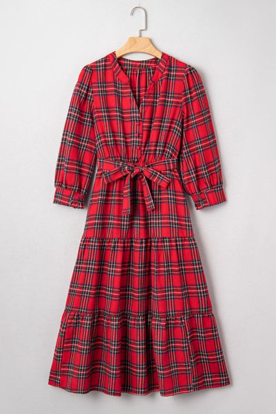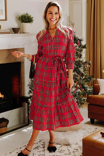 Christmas Plaid V-Neck Tie Waist Ruffle Hem Dress