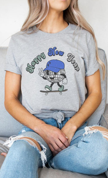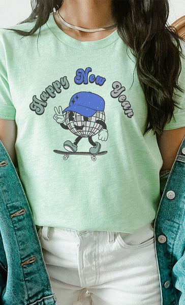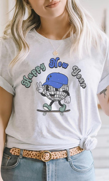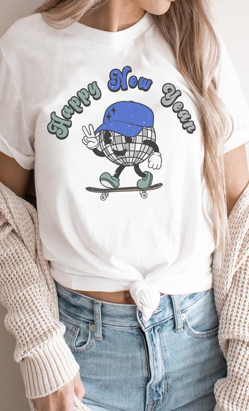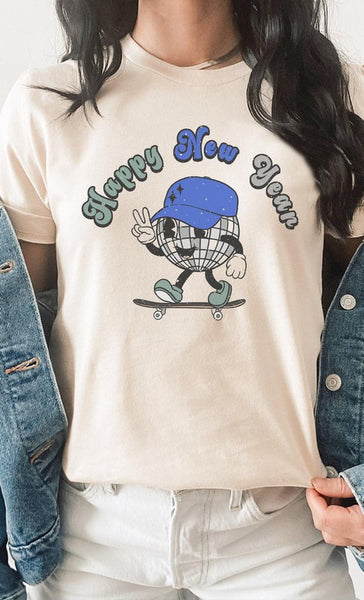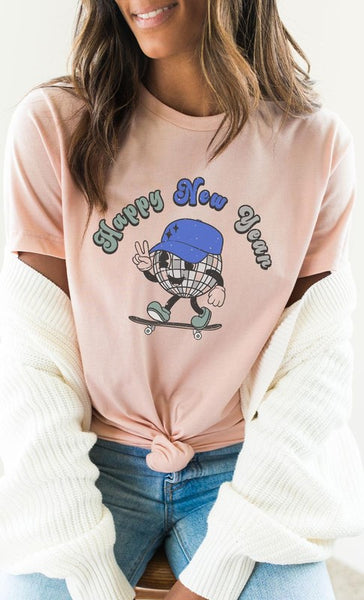 Happy New Year Disco Star Skaterboarder Graphic Tee. White and Cream tees are 100% cotton, Ash tees are 99/1 cotton/polyester blend. Peach is 52/48 cotton/poly blend.