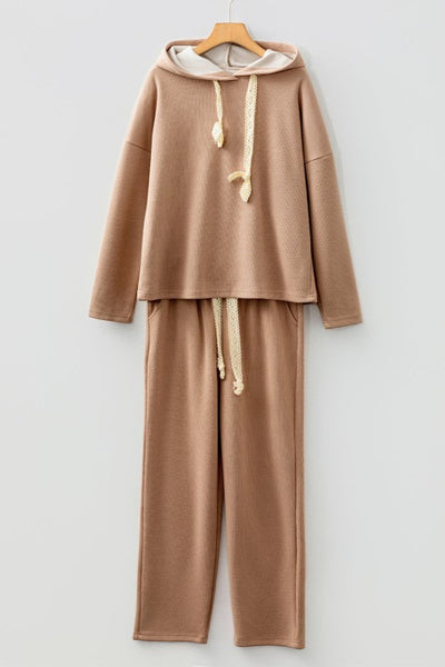 Elevate your casual wardrobe with this sophisticated two-piece corduroy suit. The set features a relaxed pullover hoodie with drop shoulders and an elegant lace drawstring detail, paired with high-waist tapered pants for a refined silhouette. Crafted from quality corduroy fabric, this coordinated ensemble transitions seamlessly from weekend lounging to casual outings. The leopard-accented drawstring adds a subtle touch of visual interest, while the thoughtful construction ensures both comfort and style. Perfect for those seeking versatile, put-together looks without compromising on ease. Polyester/Viscose/Poly/Spandex