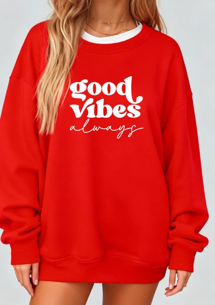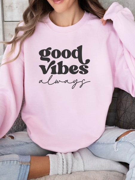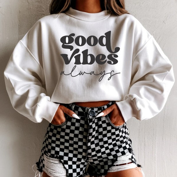 Effortless comfort with a relatable message your customers love. This cozy crewneck sweatshirt features the phrase Good Vibes Always in a clean modern script that feels playful yet wearable. Designed for everyday casual styling, it pairs perfectly with leggings denim or lounge looks.