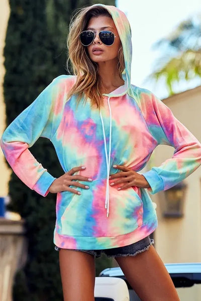 Make a bold statement with this Tie Dye French Terry Hoodie featuring a convenient Kangaroo Pocket. The vibrant tie-dye pattern adds a fun and unique touch to this cozy hoodie. Crafted from soft French terry fabric, this hoodie is perfect for lounging or casual wear. The kangaroo pocket adds both style and functionality, providing a place to keep your hands warm or store small items. Pair it with leggings or jeans for a relaxed and trendy look that will brighten up your wardrobe.