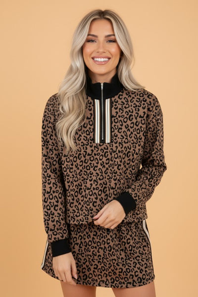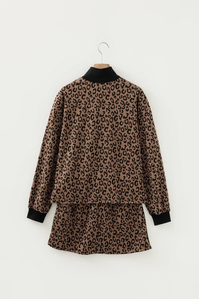 Embrace your wild side with this bold 2-piece skirt set featuring an eye-catching leopard print. The pullover top showcases a quarter-zip collar for easy layering and adjustable comfort, while the mini skirt offers a drawstring waistline and functional side pockets. Perfect for casual outings or active days, this set combines style with practicality for effortless, on-the-go wear. Polyester/Spandex