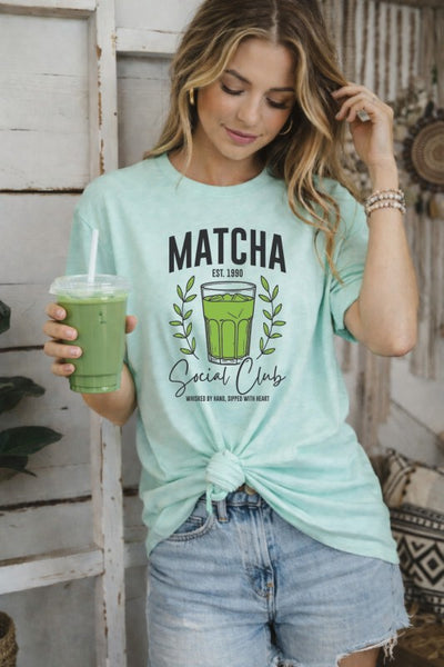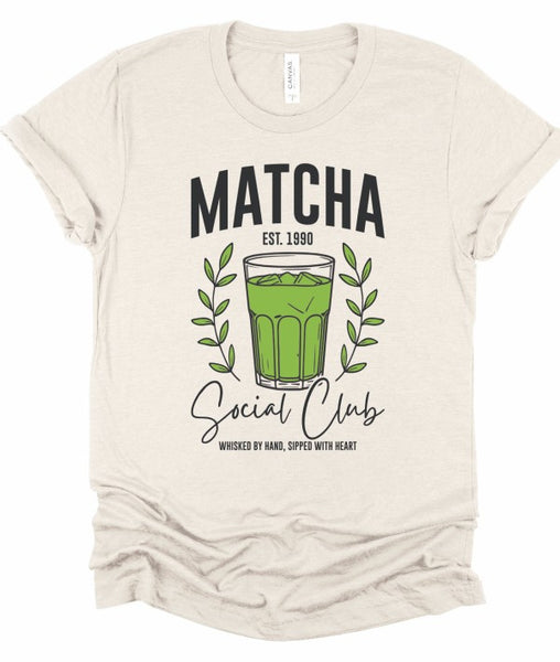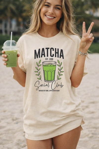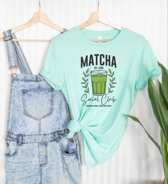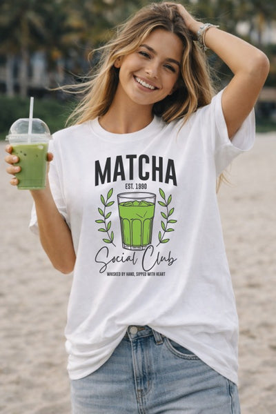 Fresh. Trendy. Effortlessly cool. Our Matcha Social Club tee is the perfect blend of laid-back lifestyle and modern café culture. Featuring a bold varsity \"MATCHA\" headline, a vibrant iced matcha graphic, and soft script \"Social Club\" detail, this design taps into the ever-growing coffee & wellness aesthetic your customers love.