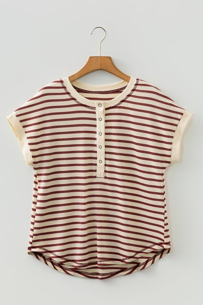 This casual essential features a timeless striped pattern and charming half-button detail at the neckline. Crafted from soft, breathable textured fabric, it keeps you cool and comfortable whether you're layering it up or going solo. The classic round neck and relaxed fit make it the perfect go-to piece for everyday style that never gets old. Dress it up or down, this striped tee does it all! Polyester/Spandex