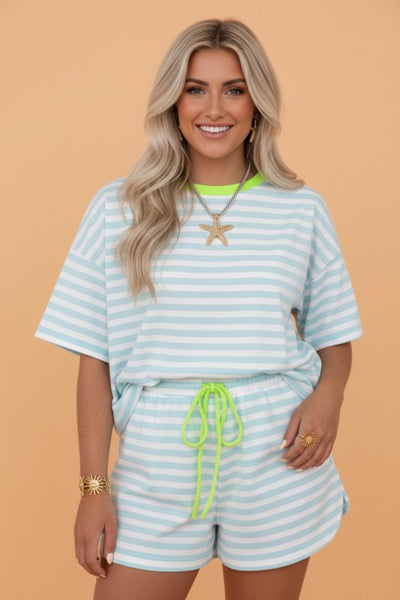 Embrace effortless summer style with this breezy two-piece set! The loose-fit tee features a charming sky blue stripe with contrast neck detailing, paired with matching drawstring shorts for the perfect laid-back look. Crafted from soft, breathable fabric, this set delivers comfort without compromising on style. Whether you're lounging at home or heading out for casual adventures, you'll love how easy it is to throw on and feel instantly put-together. Pure summer vibes, zero fuss! Cotton/Spandex