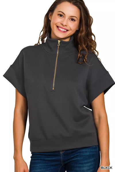 This scuba high neck half zip short sleeve pullover top offers a modern and sporty style. The high neck design provides a sleek and chic look. Featuring a half zip for added detail and versatility, this top is both functional and fashionable. With short sleeves, it is perfect for layering or wearing on its own. Stay comfortable and on-trend with this versatile and contemporary piece.